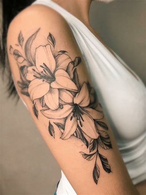 Small of the back shoulder blade hip chest area calf. Black and grey lily flower tattoo on left upper arm. Black ink lily flower tattoo on left upper arm. Flowers are one of the most beautiful things created by god and usually treated as a symbol of femininity. A lily flower tattoo usually looks good in small size but you.