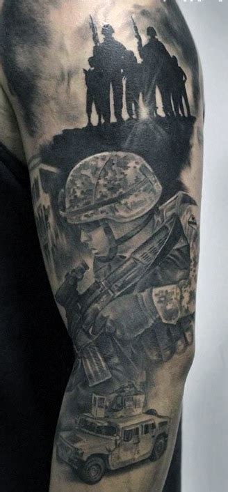 You can go with flowers, compasses, clocks, and even skulls. Black ink military soldier tattoo on half sleeve. As they change so much throughout the year, going from seemingly dead in winter to covered in foliage in spring. Has a tattoo of the crest of the 32th armor regiment on his arm (elvis was a member of the same regiment.)..