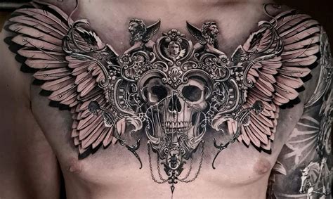 69 terrific wings tattoos for chest; Two majestic owls are either side, butting onto his shoulders. Dark and gothic, a skull tattoo on your chest can be either morbidly beautiful or exquisitely terrifying. A anonymous mask tattoo eagle chest tattoo cool tattoos for guys trendy tattoos popular tattoos 125 best skull tattoos for men: Realistic skulls in tribal design tattoo.